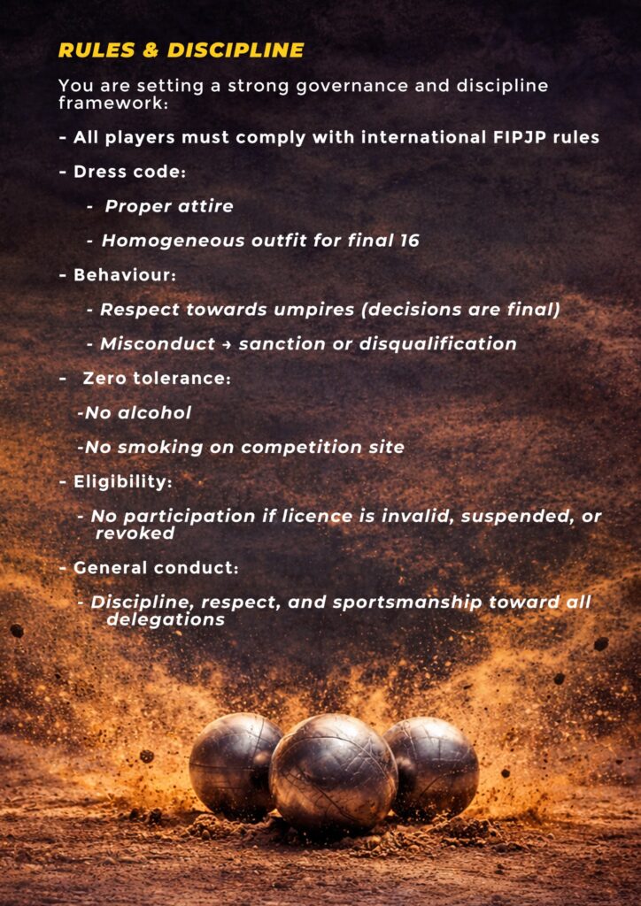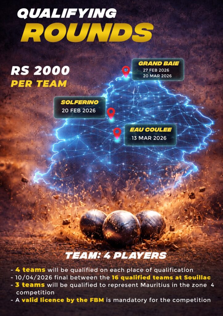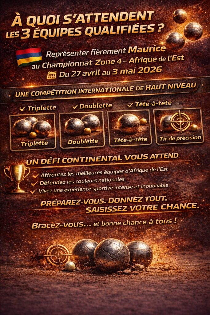La compétition se déroulera au boulodrome de Souillac, du 27 avril au 2 mai, et réunira six nations d’Afrique de l’Est : Maurice, pays hôte, Madagascar, les Seychelles, les Comores, Djibouti et le Kenya. Chaque pays sera représenté par deux équipes composées de quatre joueurs, dont un remplaçant, accompagnées d’un chef de délégation et d’un entraîneur. En tant que pays organisateur, Maurice bénéficiera de trois équipes engagées.